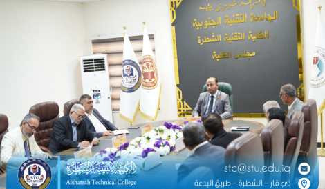 عقد مجلس الكلية التقنية_الشطرة جلسته الثالثة عشر الاعتيادية للعام 2023_2024 برئاسة عميد الكلية الاستاذ المساعد الدكتور عدنان علوان مكطوف وحضور كافة اعضاء المجلس ،
